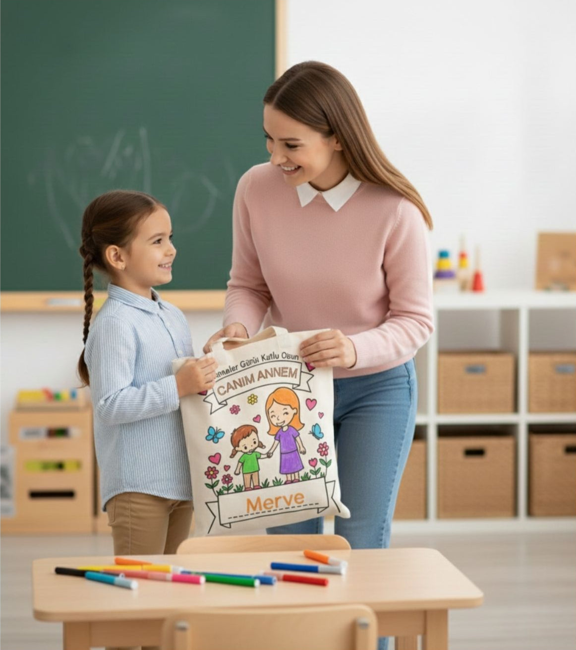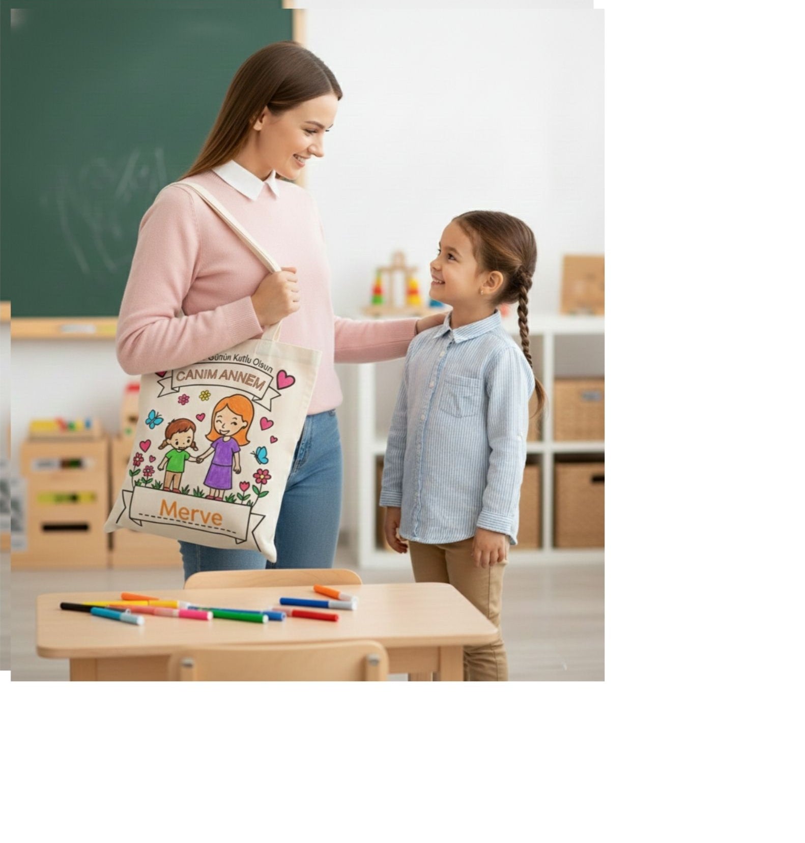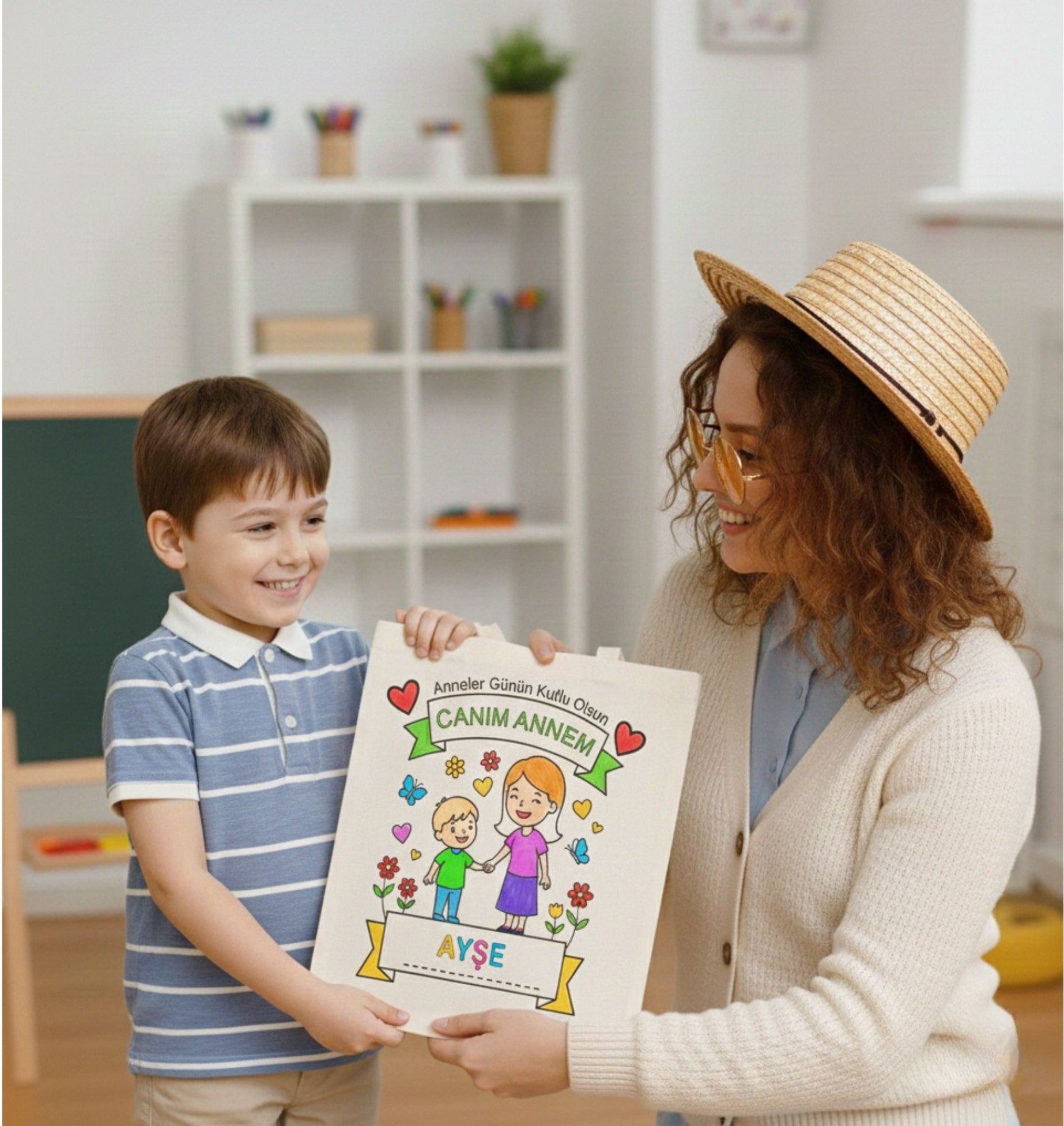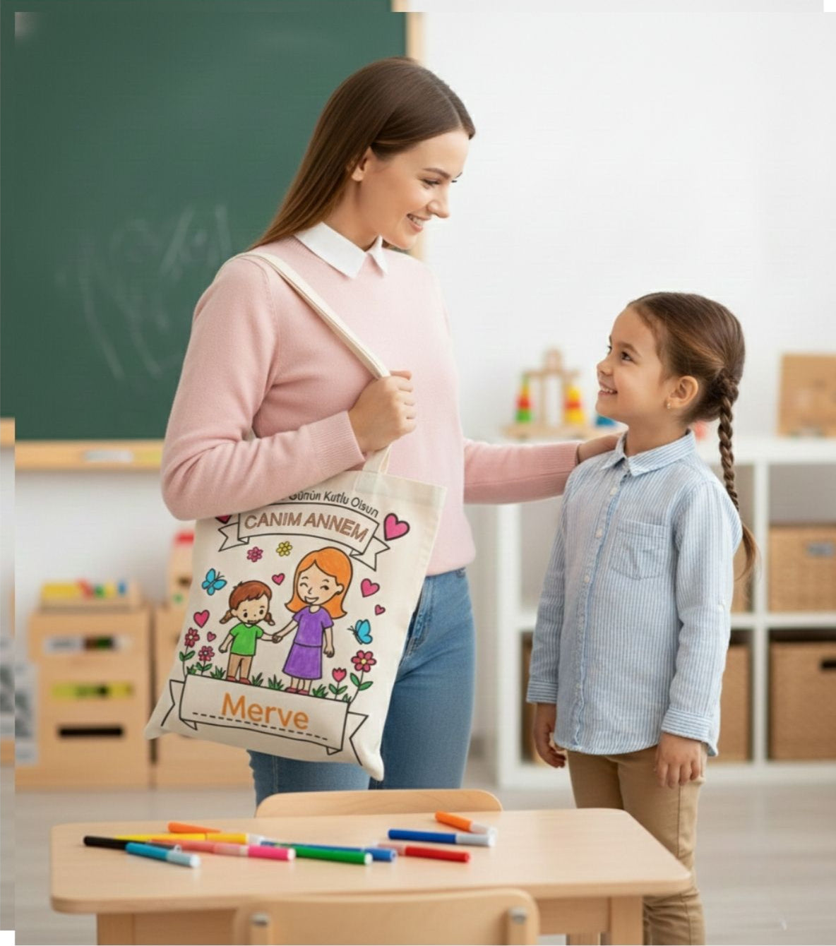 Kız veya erkek çocuk illüstrasyonu üzerine annenizin adını ekleyerek tamamen kişiye özel çanta tasarlıyoruz.